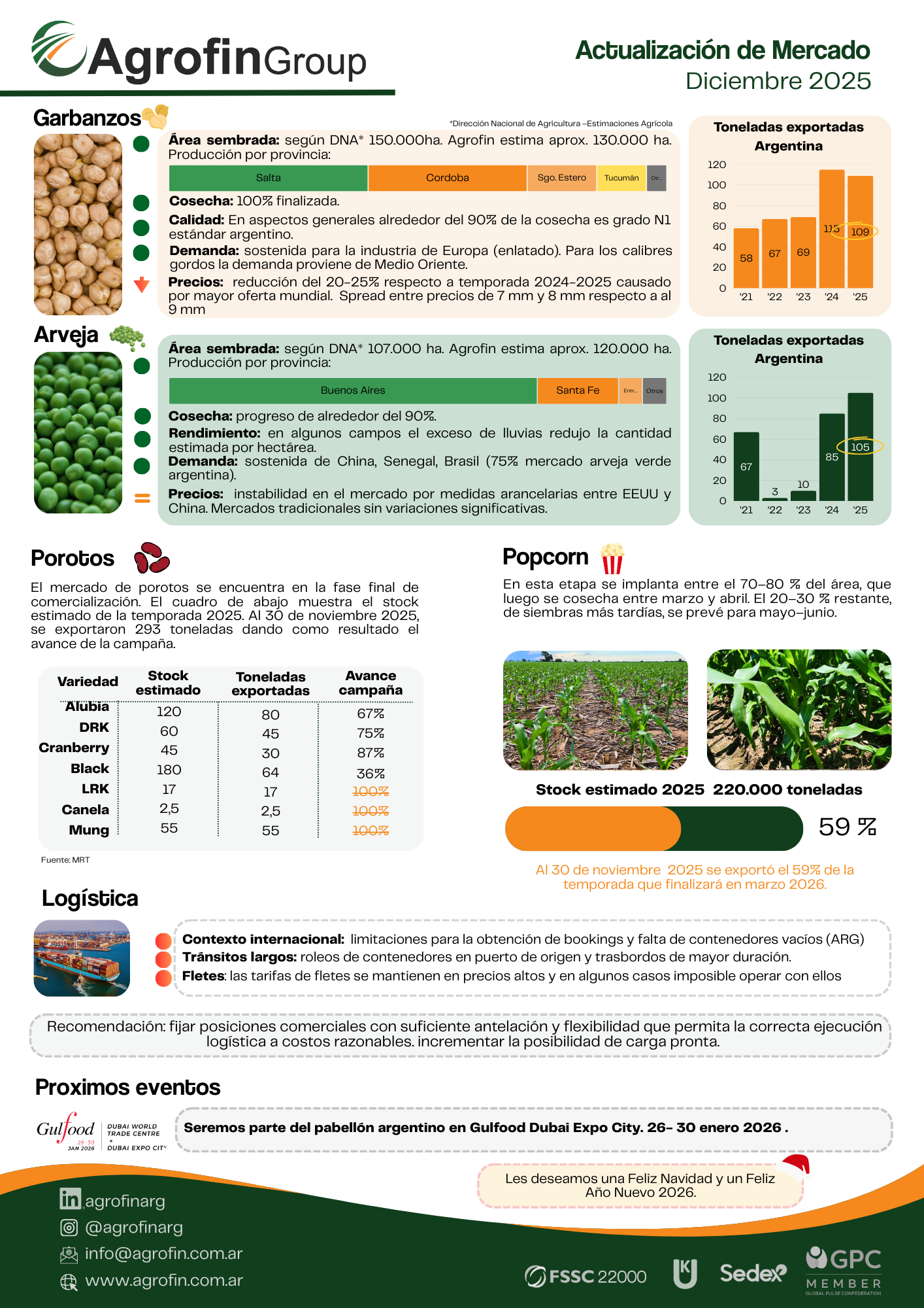 La campaña de garbanzo 2025 ha concluido con una cosecha del 100% finalizada. Agrofin estima una producción basada en aproximadamente 130.000 hectáreas, concentradas principalmente en las provincias de Salta y Córdoba.